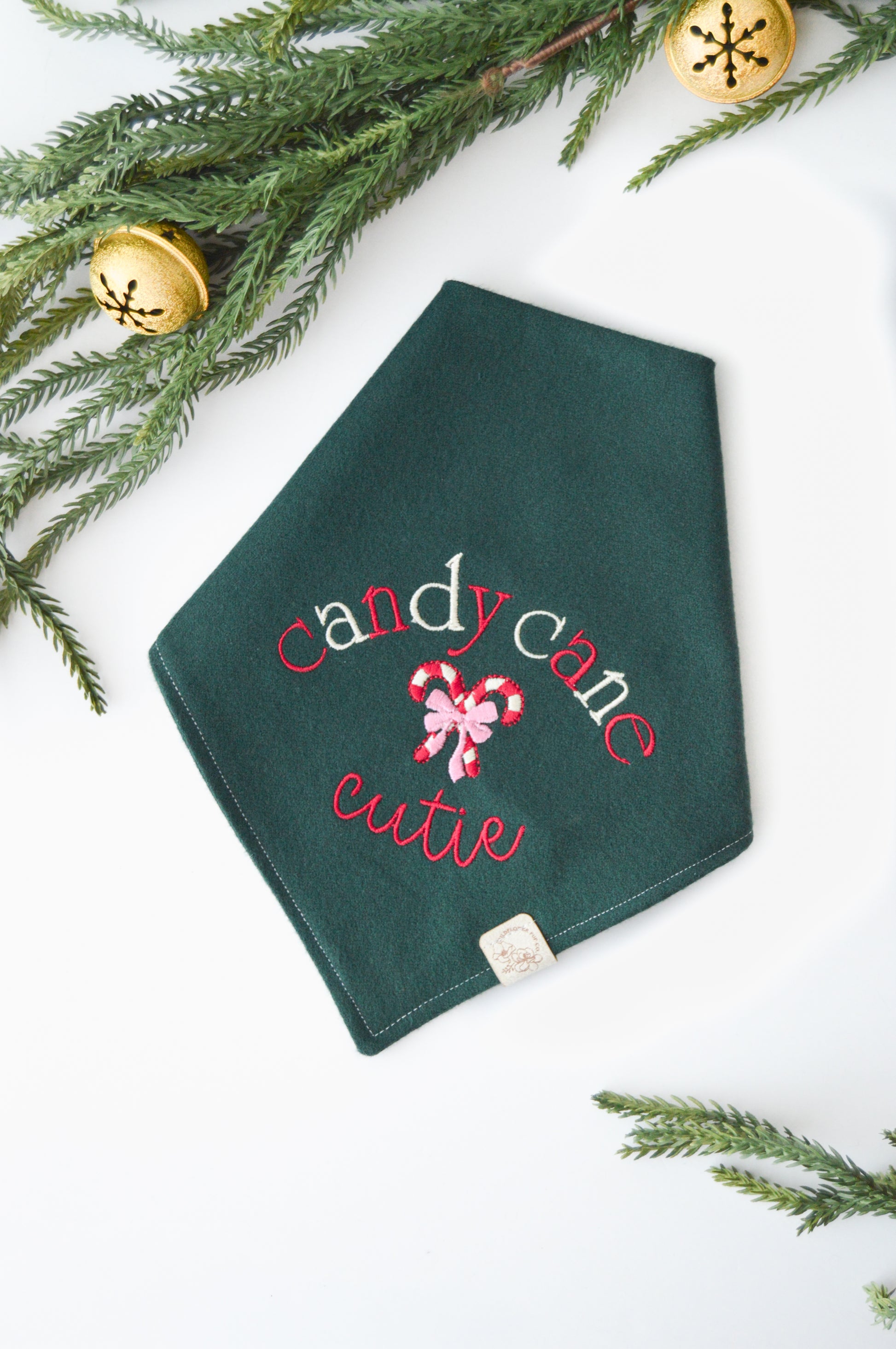 This bandana is made from a forest green flannel and features a festive holiday embroidery design.