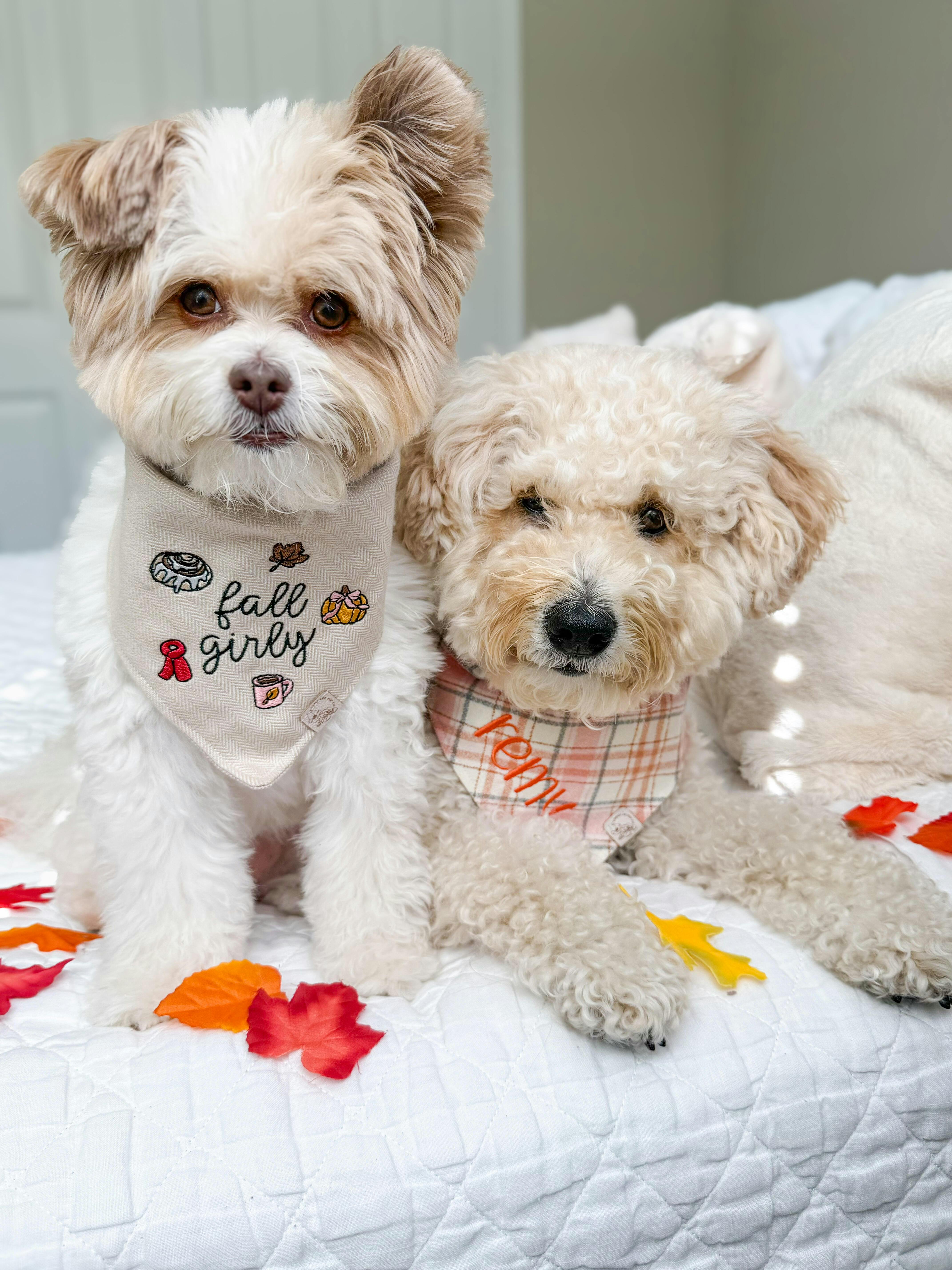 These embroidered styles are made with a soft cream colored herringbone flannel and feature the coziest icons (cinnamon roll, coffee mug, pumpkin, falling leaves, and a classic red scarf (any Taylor fans?😉). Available with either the phrase "Fall Girly" or "Cozy Club" stitched in the center. Use the text box to indicate which design you would like.