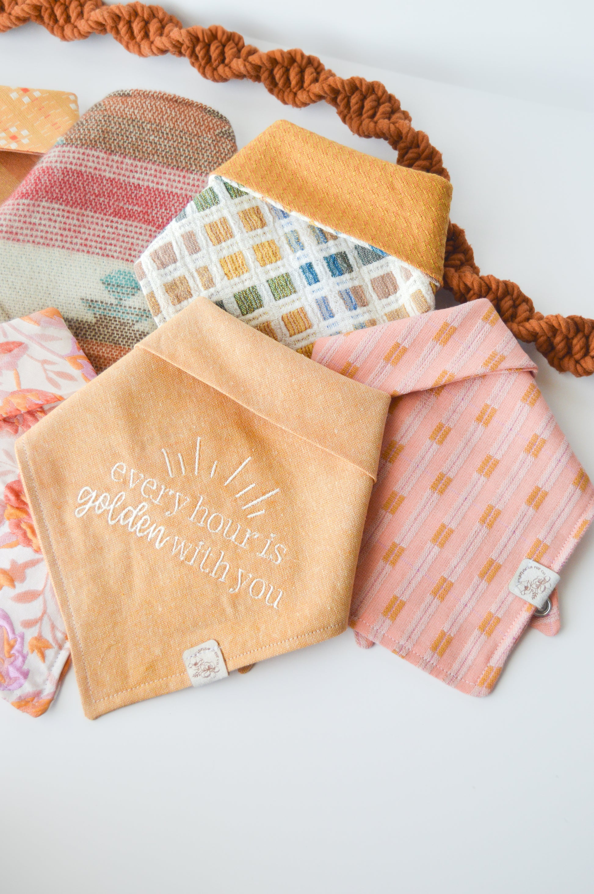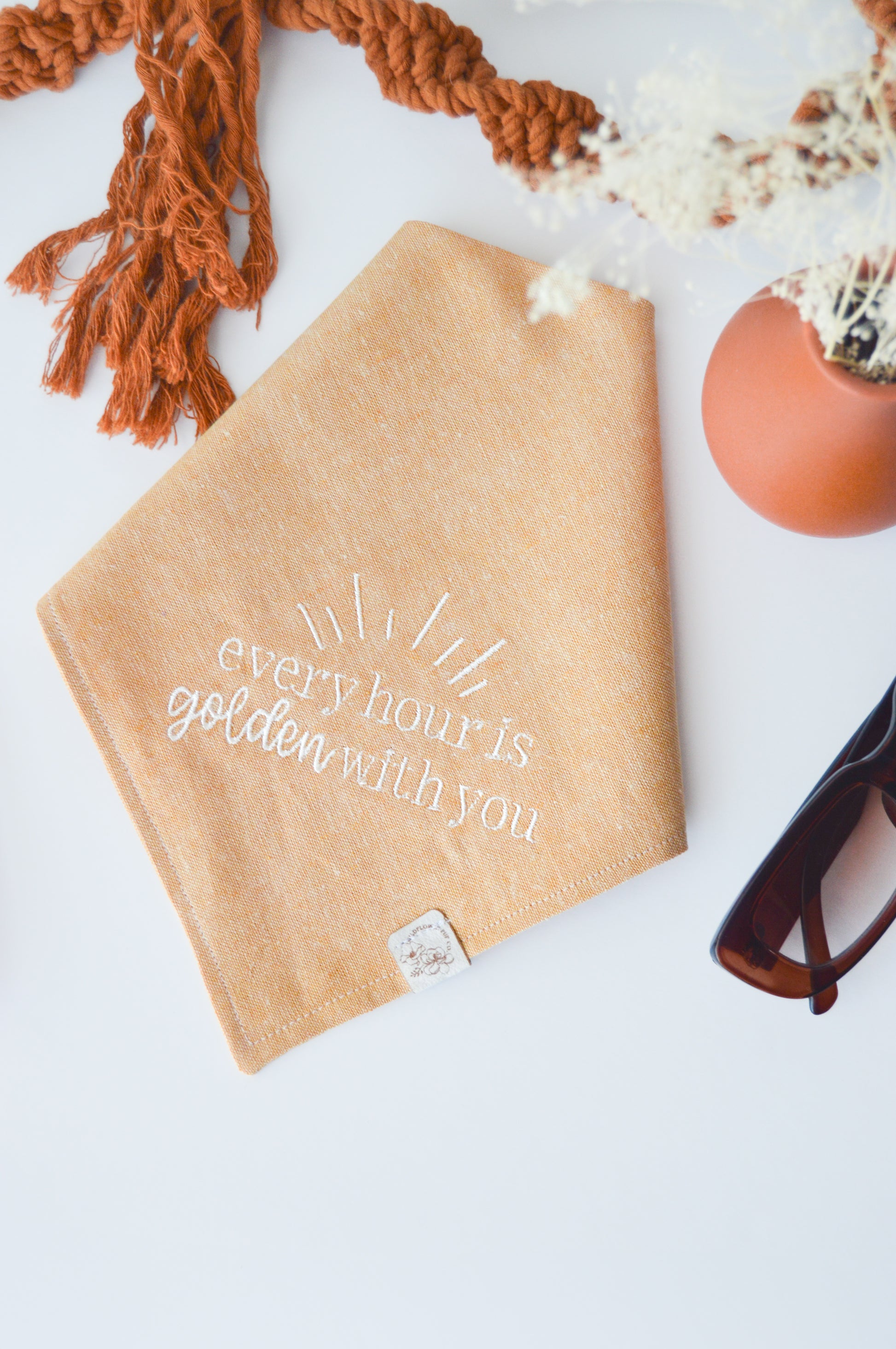 Every Hour Is Golden with our pups! This bandana is embroidered on a golden linen fabric with cream colored thread.