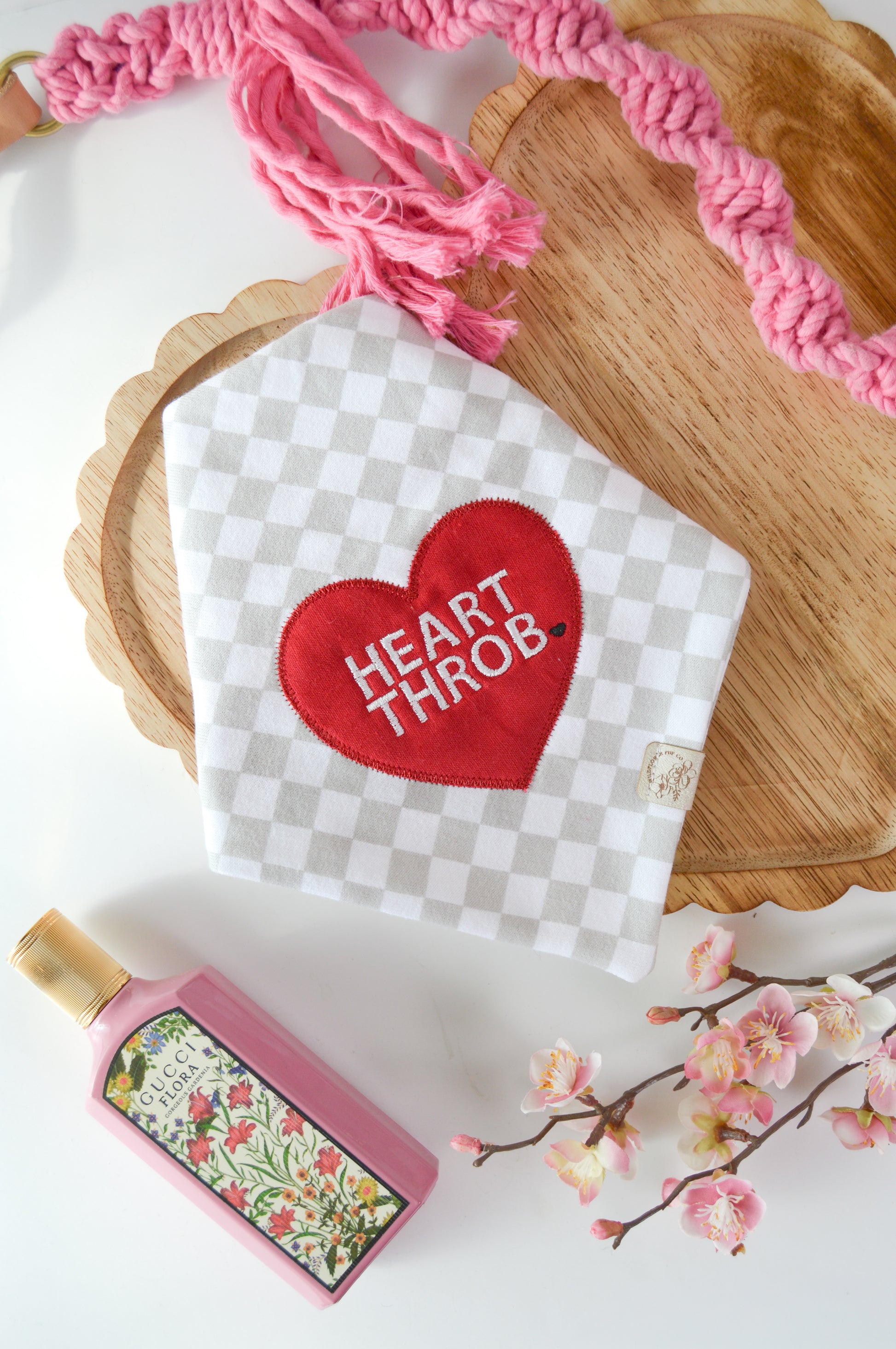 This bandana is made from a checkered sweatshirt material featuring an appliqué heart design.