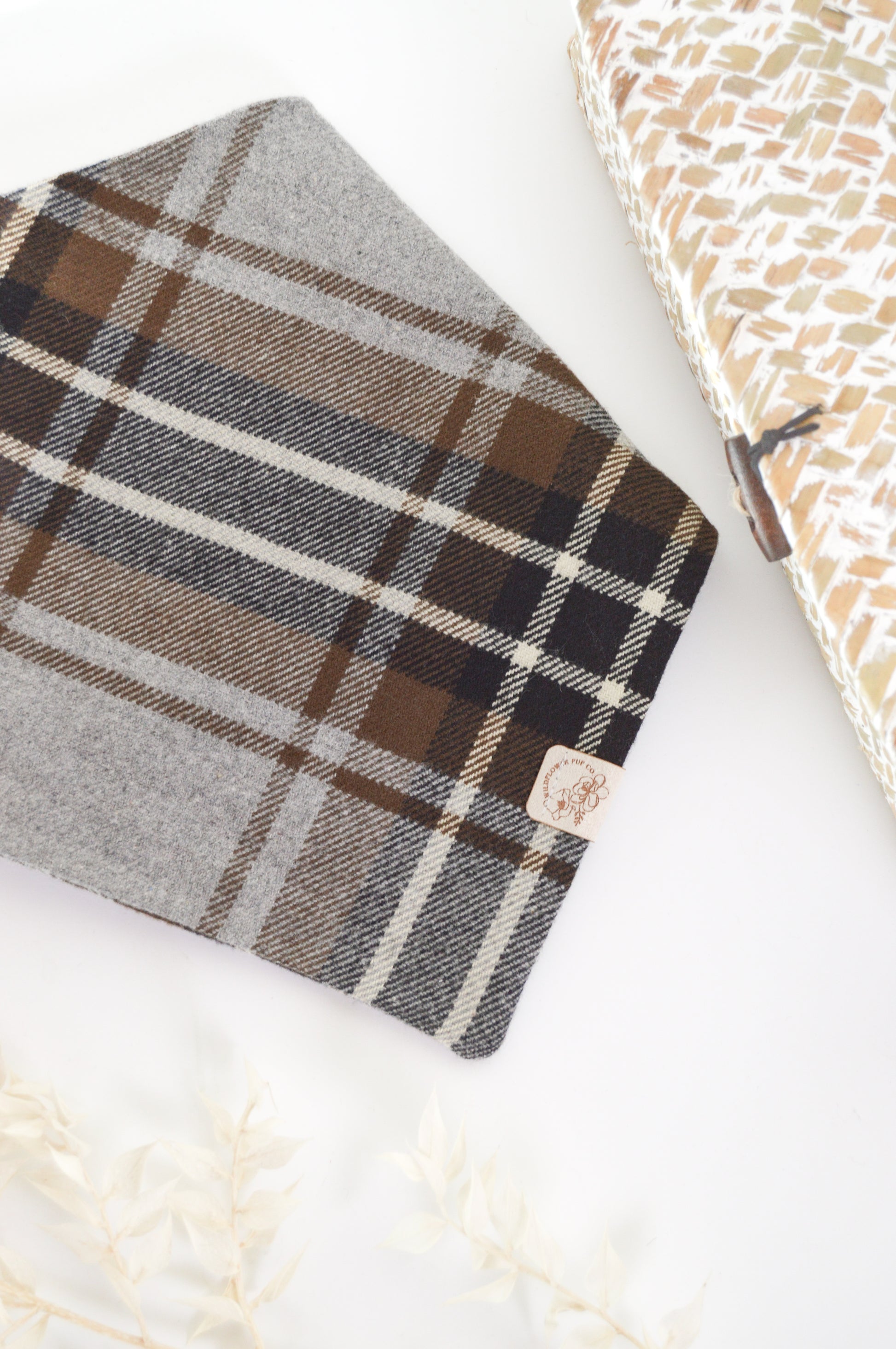 Made from a soft brushed flannel, this double-sided bandana features a plaid design in grey, brown, black, and cream colors.