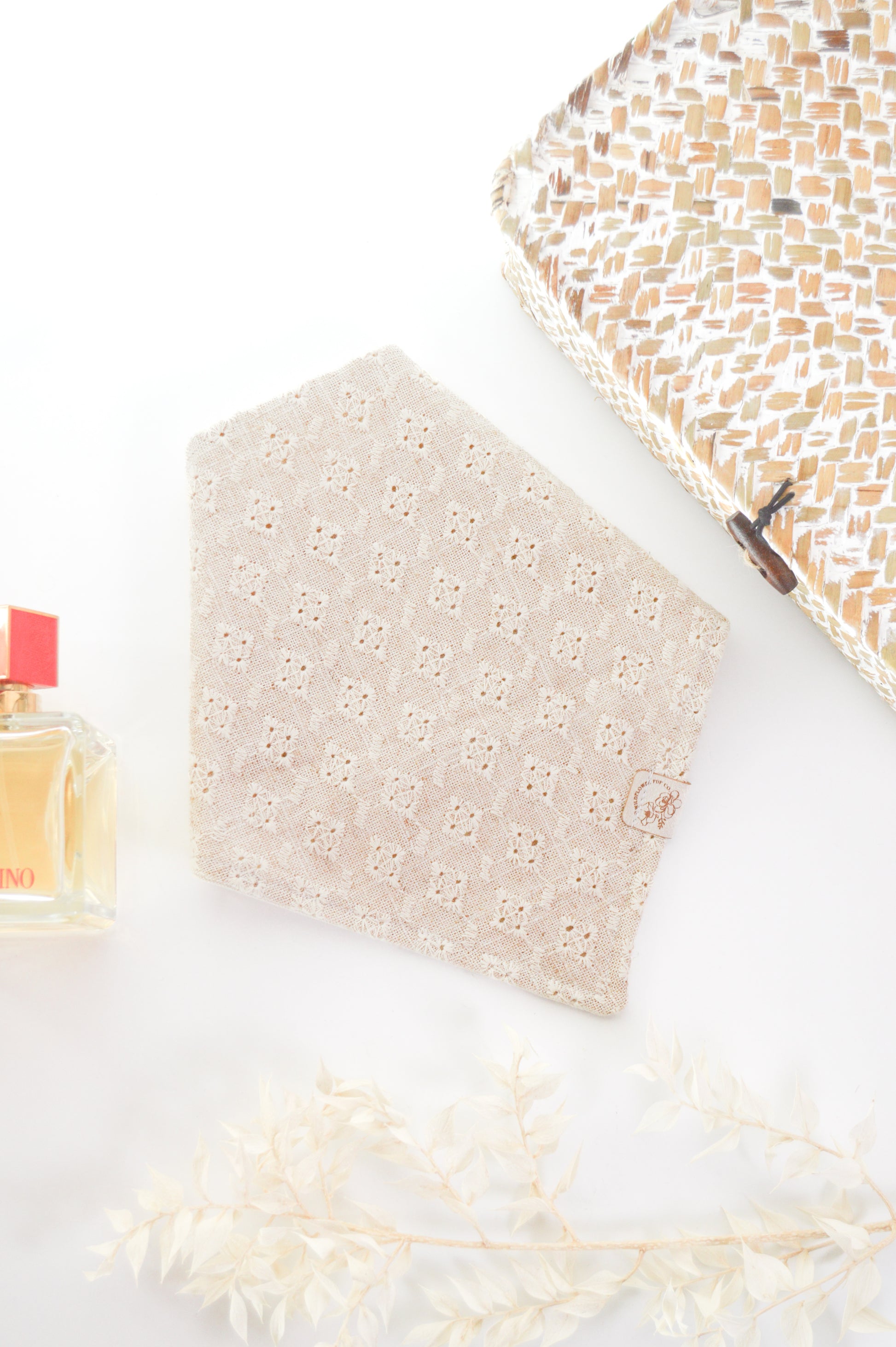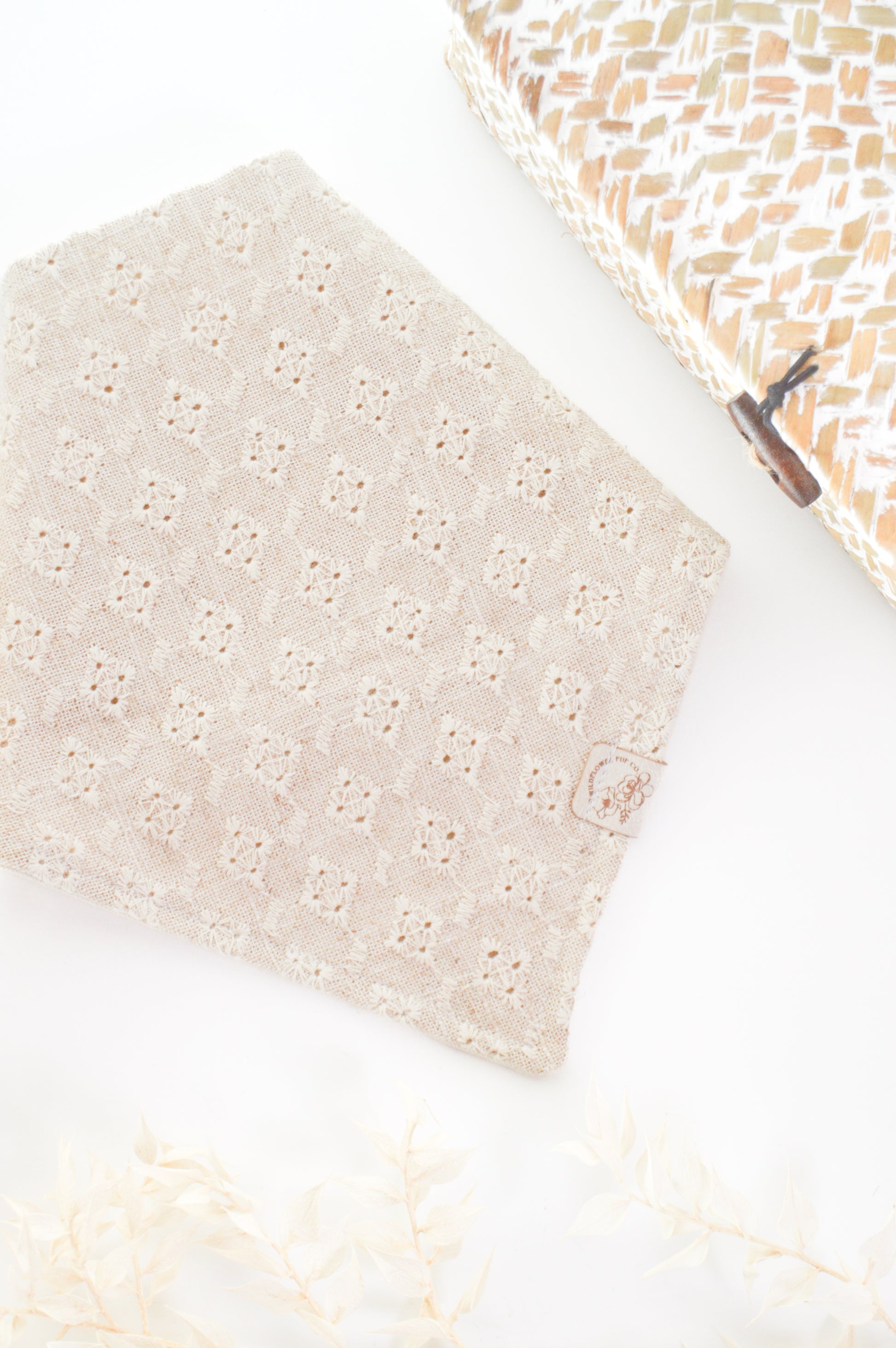 This bandana is made from an embroidered eyelet material and backed with a neutral linen.