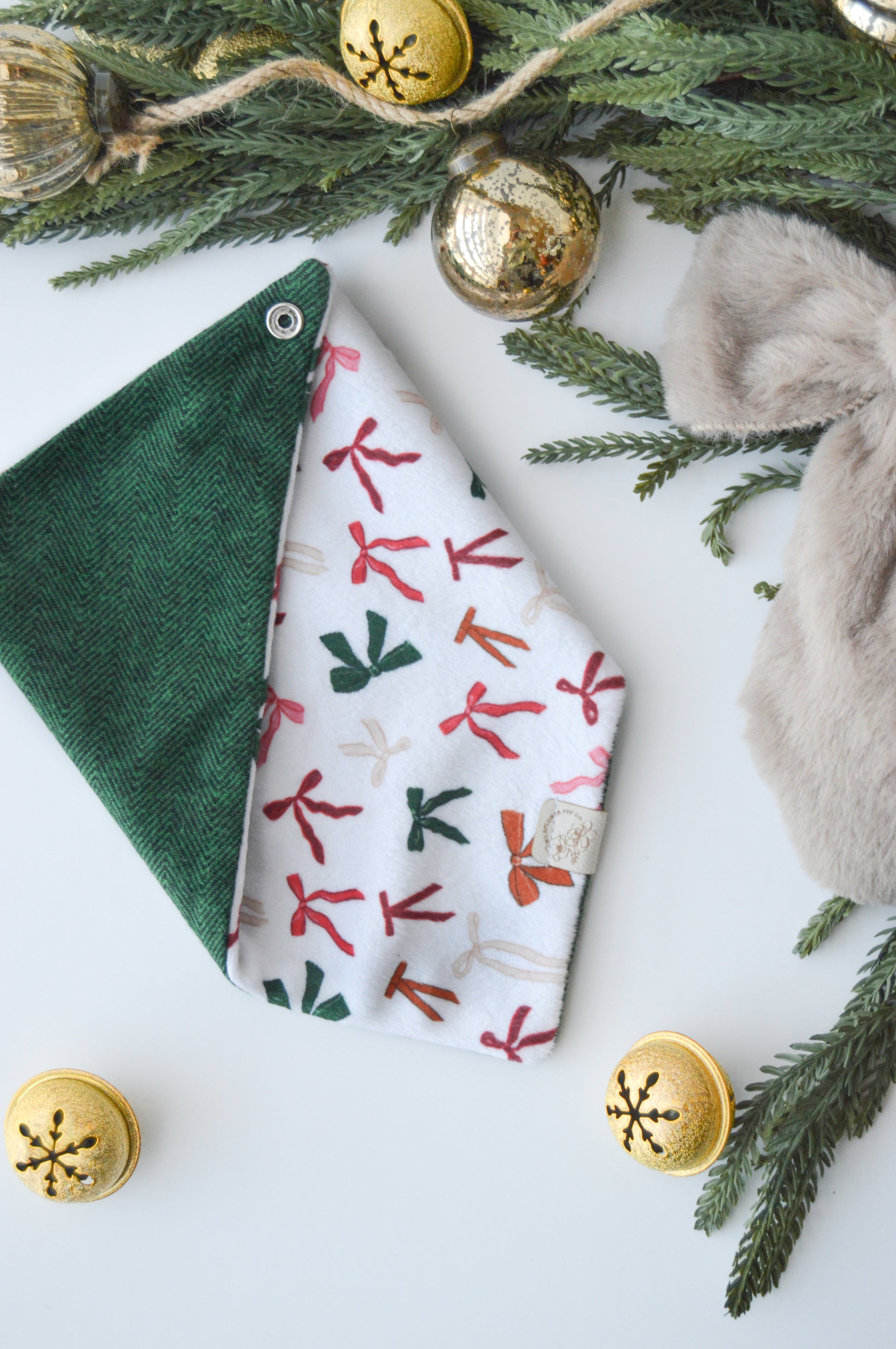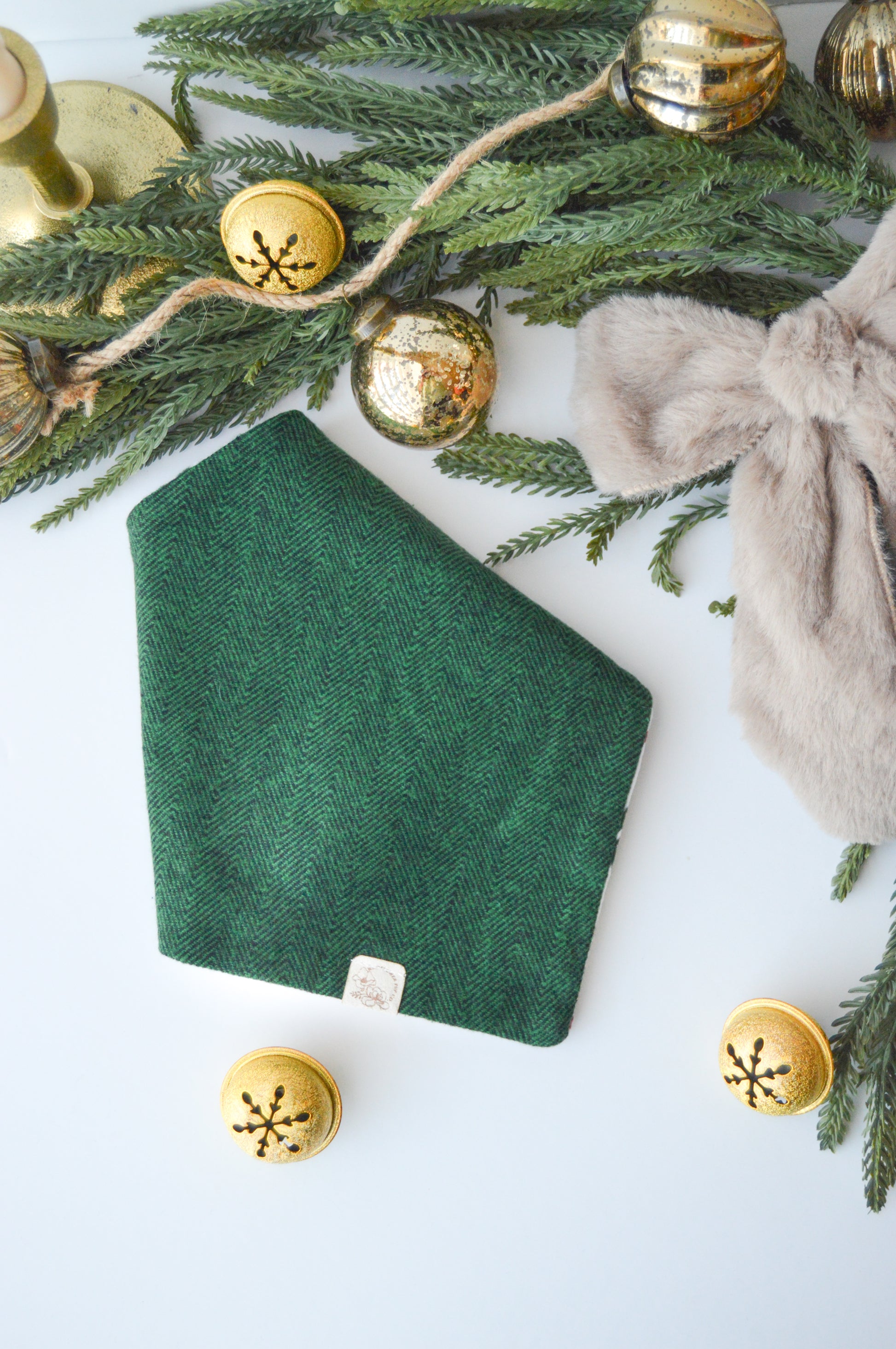 This bandana is made from a minky fabric on the bow side & a gorgeous emerald green herringbone flannel on the reverse side!
